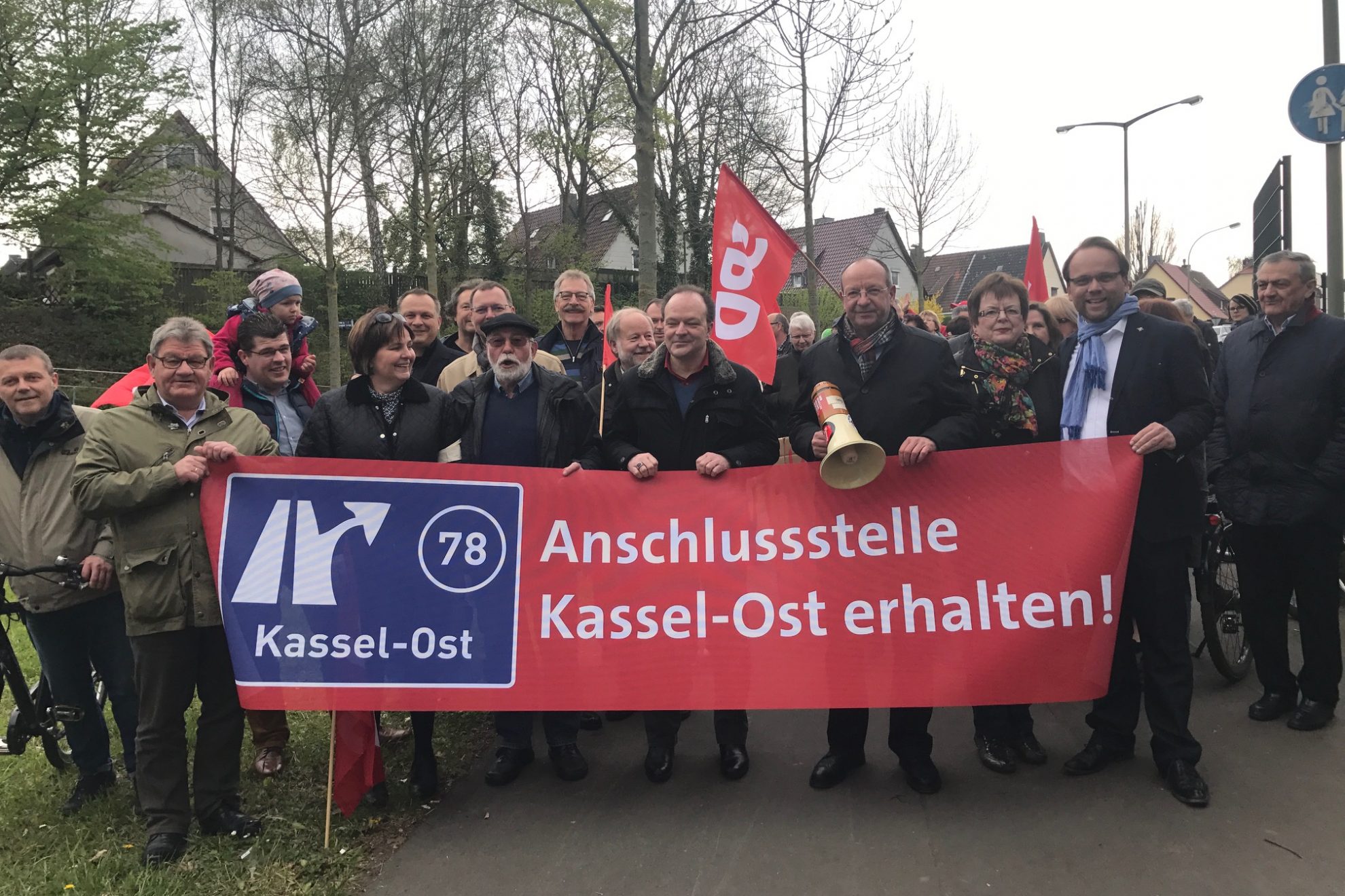 Initiiert wurde die Demo von den SPD-Landtagsabgeordneten Wolfgang Decker, Timon Gremmels und Uwe Frankenberger und der Bundestagsabgeordneten Ulrike Gottschalck. Auch die SPD-Stadtteilvertreter aus Forstfeld, Bettenhausen und Waldau zeigten gemeinsam mit ihren Kolleginnen und Kollegen aus Kaufungen, Lohfelden und Niestetal Flagge für den Erhalt des Anschlusses. Die Bürgermeister aus Kaufungen, Niestetal und Fuldabrück machten mit ihrer Anwesenheit ebenfalls deutlich, dass man den Wegfall nicht hinnehmen werde. “Dies würde zu erheblichen Schleich- und Ausweichverkehren im Kasseler-Osten sowie in Kaufungen und Lohfelden führen.