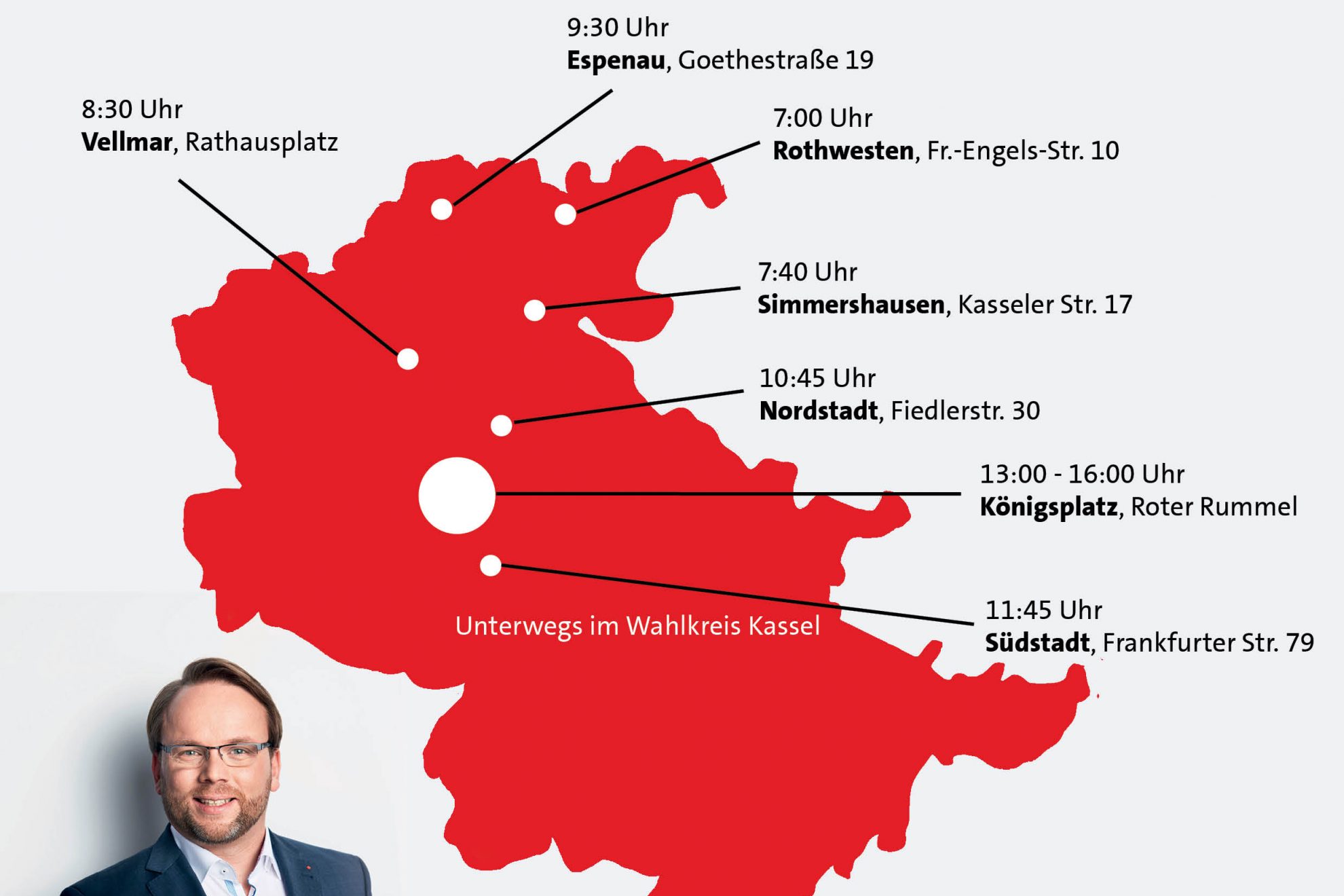 SPD-Bundestagskandidat Timon Gremmels wird am Samstag eine Bus-Tour zu sieben Infoständen vor Ort machen. Er wird begleitet von Uwe Schmidt, Susanne Selbert, Martina Werner und Ulrike Gottschalck. Alle Sozialdemokraten werden in Fuldatal, Vellmar, Espenau und Kassel an den sieben SPD-Infoständen für Fragen der Bürger zur Verfügung stehen und für die Wahl der SPD werben. Den krönenden Abschluss wird die Tour auf dem Königsplatz finden, wo die Kasseler SPD ab 11 Uhr den traditionellen Roten Rummel veranstaltet. Neben Gesprächen wird es auch musikalische Unterhaltung geben. Speisen und Getränke können zu familienfreundlichen Preisen erworben werden. Für die kleinen Gäste gibt es Ballons und eine Fahrt im Kinderkarussell.