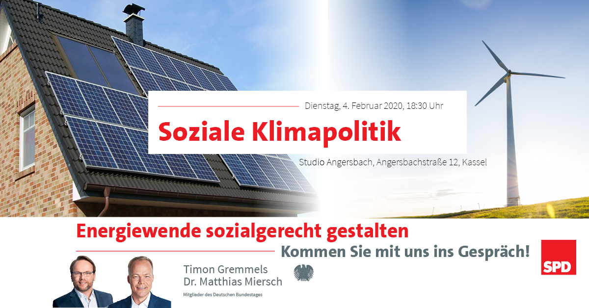 SPD-Bundestagsfraktion vor Ort zum Thema „Sozialer Klimaschutz“ am Dienstag, 4. Februar 2020 – 18:30 Uhr im Studio Angersbach, Angersbachstraße 12, 34127 Kassel, mit Timon Gremmels, MdB und Dr. Matthias Miersch, MdB.