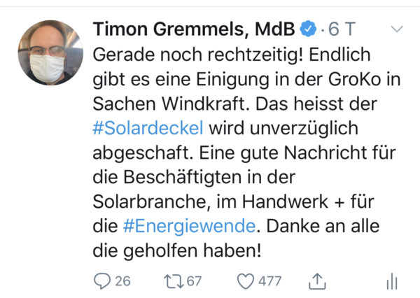 Gerade in Zeiten der Corona-Pandemie und der Diskussion über ein nachhaltiges Konjunkturprogramm, braucht es diesen neuen Wachstumsschub für die Solarenergie, der preiswertesten und in der Bevölkerung akzeptiertesten Form der erneuerbaren Energieerzeugung. Doch der einst von Peter Altmaier (CDU) als damaliger Umweltminister eingeführte Solardeckel hätte die Förderung vieler neuer Solaranlagen schon in wenigen Monaten vollständig auslaufen lassen. Ein deutlicher Einbruch beim Ausbau der Solarenergie wäre die Folge gewesen; ein Szenario, das wir mit der Einigung verhindern konnten. Mitte Juni wird der Bundestag die Abschaffung des Solardeckels beschließen.