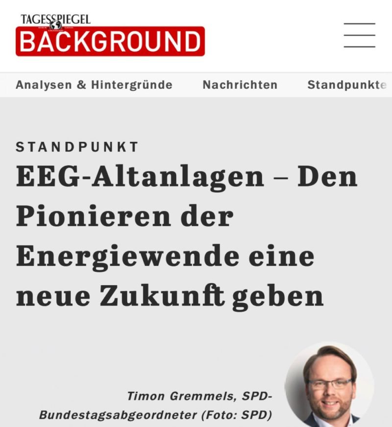 Das Auslaufen der EEG-Förderung für Solaranlagen ist seit Jahren bekannt. Doch der Bundeswirtschaftsminister bleibe eine politische Lösung für die ausgeförderten Solaranlagen schuldig, kritisiert der SPD-Bundestagsabgeordnete Timon Gremmels. Er schlägt eine Lösung in drei Schritten vor.
