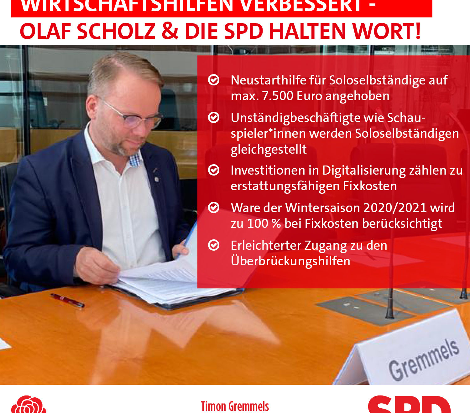 Außerdem erstatten wir Unternehmen bis zu 20 000 Euro für Investitionen in Hygienemaßnahmen und Digitalisierung, zum Beispiel für einen neuen Online-Shop.