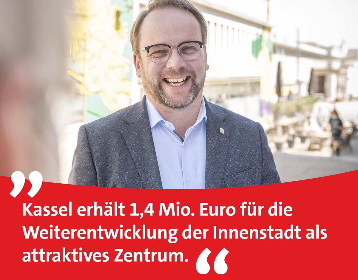 Gute Nachrichten für Kassel übermittelt der SPD-Bundestagsabgeordnete Timon Gremmels: „Der Bund bewilligt erste Maßnahmen aus dem Förderprogramm „Zukunftsfähige Innenstädte und Zentren“, das mit insgesamt 250 Millionen Euro ausgestattet ist und wir sind dabei.“