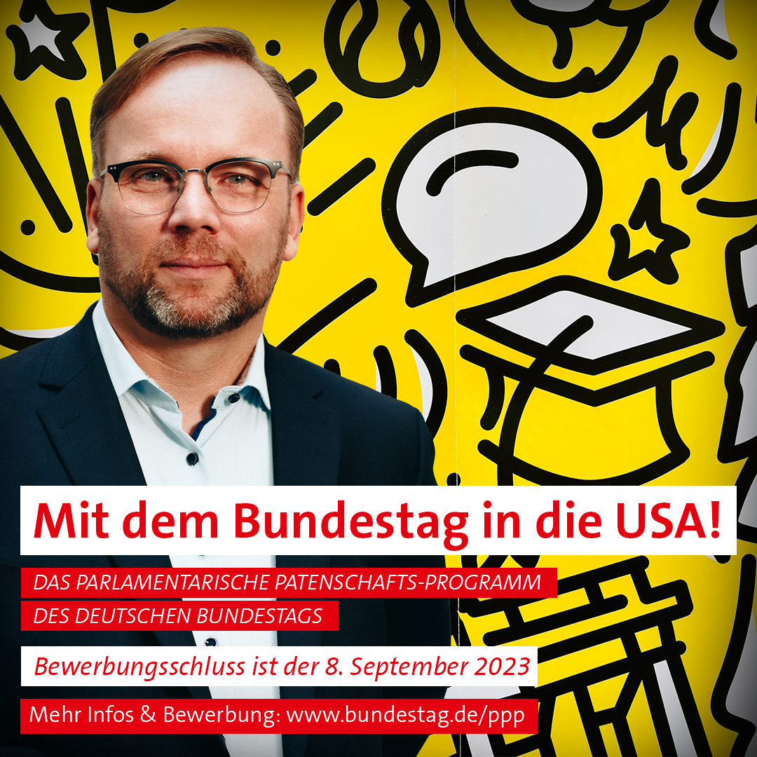 Seit 1983 gibt das Parlamentarische Patenschafts-Programm (PPP) alljährlich Schülerinnen und Schülern sowie jungen Berufstätigen und Auszubildenden die Möglichkeit, mit einem Stipendium des Deutschen Bundestages ein Austauschjahr in den USA zu erleben. Da das PPP ein gemeinsames Programm des Deutschen Bundestages und des US-Congress ist, sind zeitgleich auch junge US-Amerikanerinnen und -Amerikanern für ein Austauschjahr zu Gast in Deutschland. Die Teilnehmenden aus beiden Ländern bekommen für ihre Austauschzeit eine Patin oder einen Paten aus dem Bundestag zur Seite gestellt. Das PPP ermöglicht seit 1983 jedes Jahr jungen Deutschen, ein Schuljahr in den USA zu erleben. Zeitgleich sind junge US-Amerikaner*innen zu einem Austauschjahr zu Gast in Deutschland.