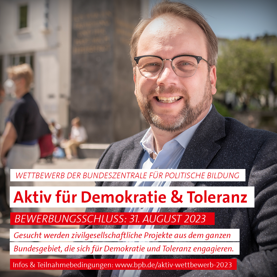 Gesucht werden zivilgesellschaftliche, überwiegend ehrenamtlich getragene Projekte aus dem ganzen Bundesgebiet, die sich auf vorbildliche Weise für Demokratie und Toleranz engagieren. Den Gewinnenden winken u.a. Geldpreise in Höhe von 2.000 bis 10.000 Euro sowie jährliche Qualifizierungs- und Vernetzungsangebote. Bewerben für den Wettbewerb kann man sich online unter www.bpb.de/aktiv-wettbewerb-2023. Bewerbungsschluss ist der 31. August 2023. Von der Teilnahme ausgeschlossen sind Projekte, die durch Bundesmittel finanziert werden.