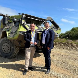 HÜBNER-Geschäftsführer Helge Förster (r.) führte Timon Gremmels, Bundestagsabgeordneter für Kassel und die Region, durch die Produktion für Schienenübergangssysteme.