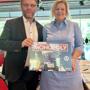 Auf dem Landesparteitag 2023 habe ich Nancy Faeser im Namen meines THW-Ortsvereins Kassel ein THW-Monopoly überreichen dürfen.