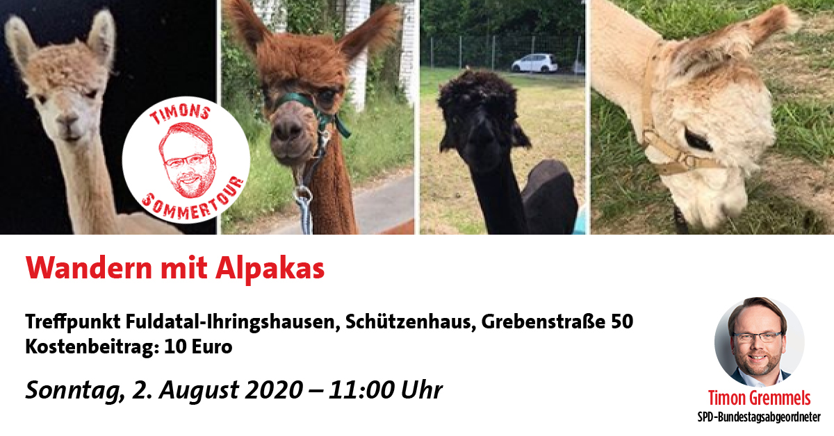 Wo: Fuldatal-Ihringshausen Schützenhaus, Grebenstraße 50 Kostenbeteiligung: 10,- Euro Anmeldung bitte an timon.gremmels.wk@bundestag.de oder 0561/700 10 52 Einmal mit Alpakas wandern - dazu lade ich im Rahmen meiner Sommertour zu einer […]