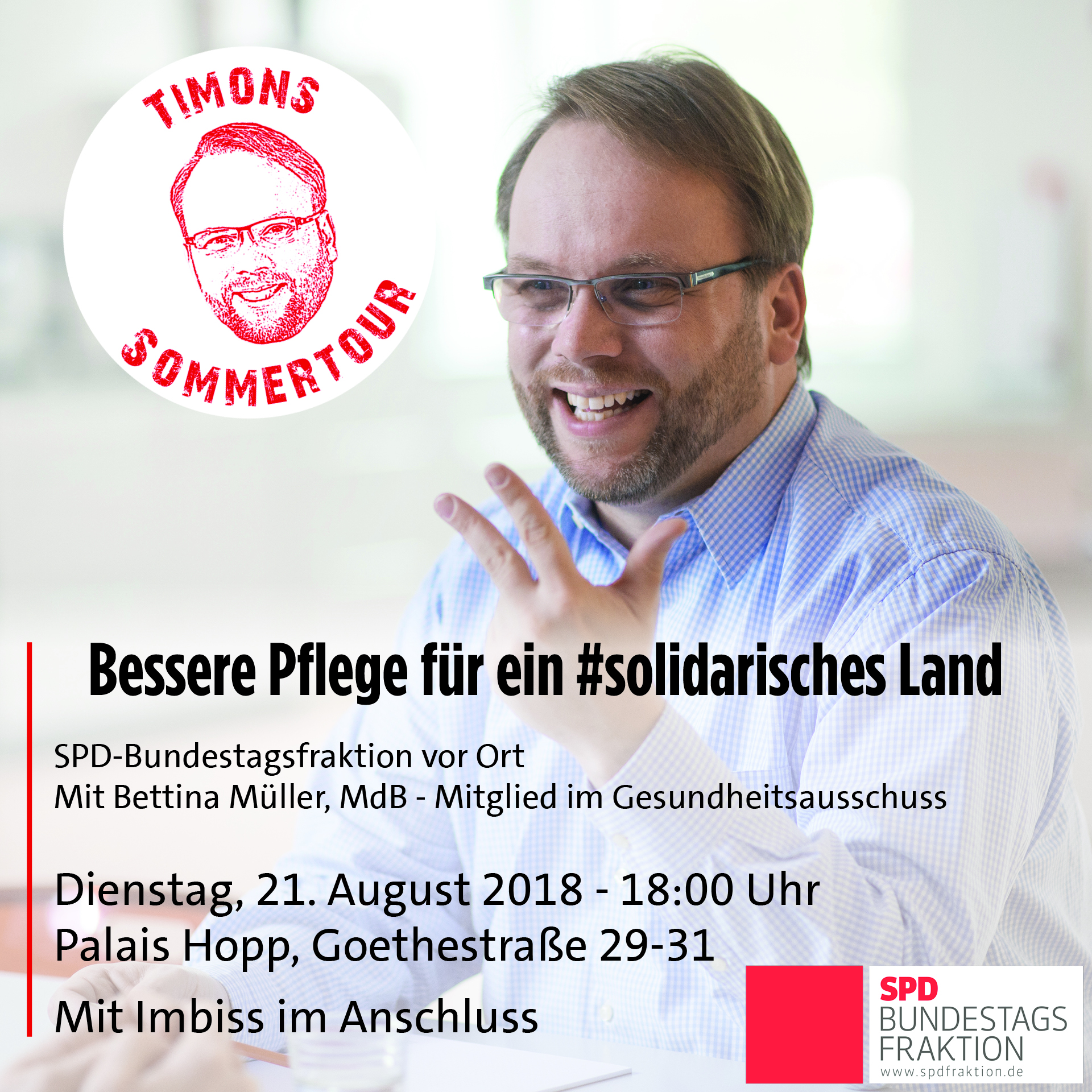 Palais Hopp, Goethestraße 29-31, Kassel Goethestraße 29-31, Kassel, HessenDie Veranstaltung „Pflege stärken - für ein solidarisches Land“ findet am kommenden Dienstag, 21. August 2018 - 18:00 Uhr, im Palais Hopp, Goethestraße 29-31 in Kassel statt. Um Anmeldung an timon.gremmels.wk@bundestag.de wird gebeten. Es wird zudem ein Imbiss gereicht.
